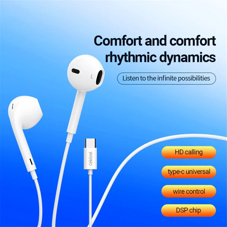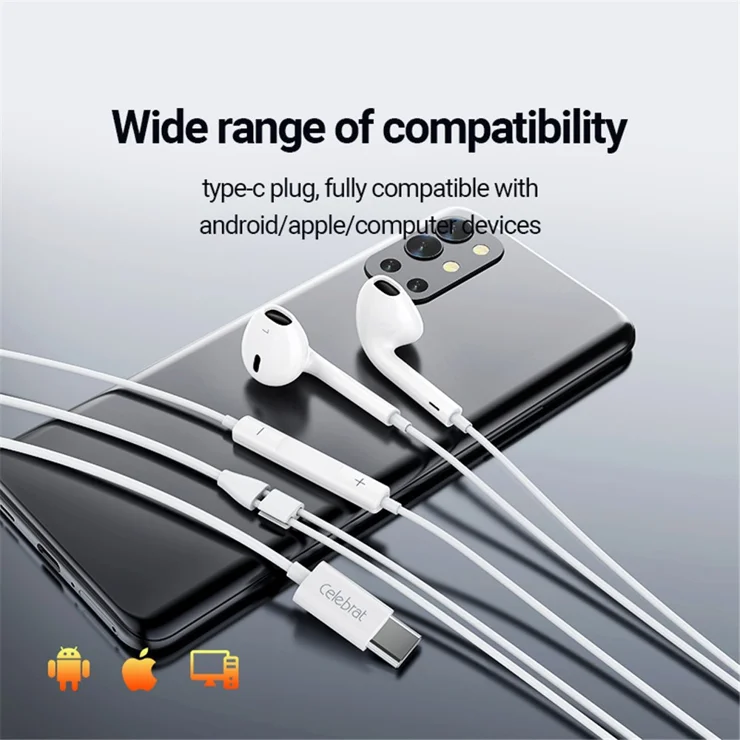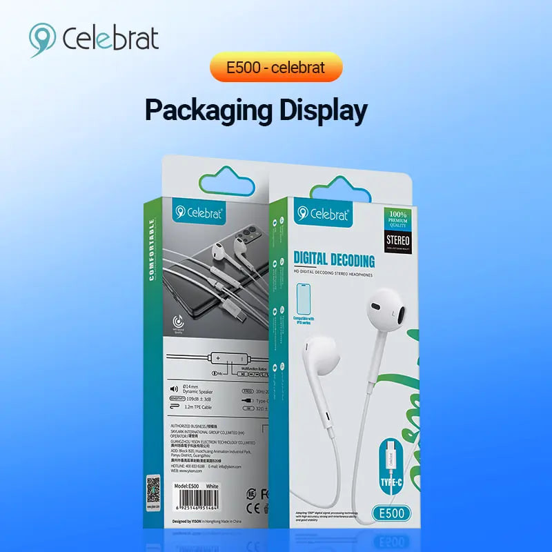 هندزفری سیمی Celebrat E500 با اتصال USB-C، صدای شفاف و باس قدرتمند، میکروفون داخلی و کابل مقاوم، انتخابی اقتصادی و عالی برای موسیقی، تماس و استفاده روزمره با گوشیهای جدید است.