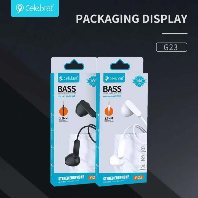 هندزفری سیمی Celebrat G23 با صدای شفاف، بیس تقویتشده، میکروفون HD و طراحی ارگونومیک انتخابی عالی و اقتصادی برای موسیقی و مکالمه است. سازگار با تمام دستگاههای دارای جک ۳.۵ میلیمتری.